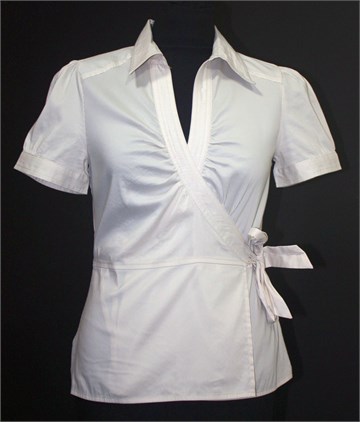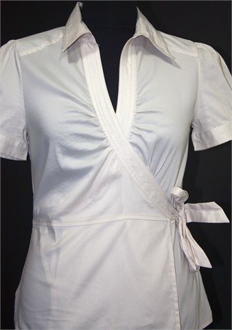 H&M košulja sa kratkim rukavima, bijele boje sa bež prugicama. Vezanje i preklop sa prednje strane. Lagan i rastezljiv materijal.