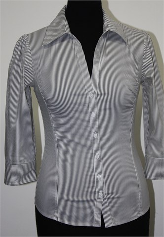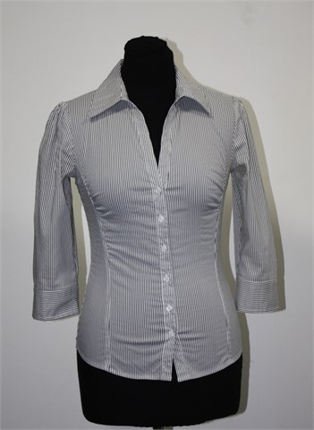 H&M košulja sa poludugim rukavima, bijele boje sa crnim/tamno sivim prugama. Prednje kopčanje, strukirana, blagi puf rukavići. Lagan i vrlo rastezljiv materijal.
