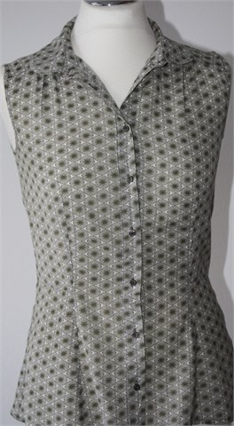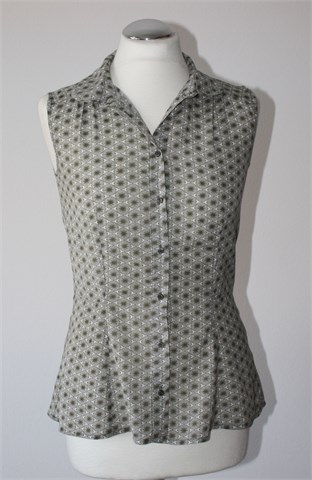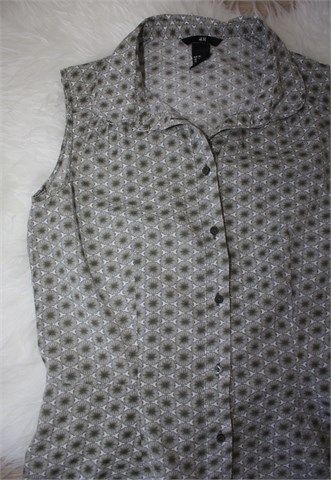 H&M košulja bez rukava, bijele boje sa maslinasto zelenim printom (uzorak printa kao na slikama). Prednje kopčanje, blagi peplum kroj. Tanja i lagana, nije rastezljiva.