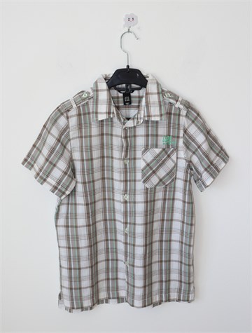 H&M Young košulja bijele boje sa prugasto-kariranim uzorkom (boje i uzorak vidljivi na slikama). Prednje kopčanje, džepić na prsima. Mali bočni prorezi. Tanji i mekan pamuk.