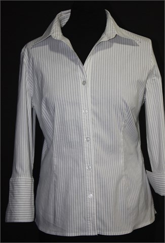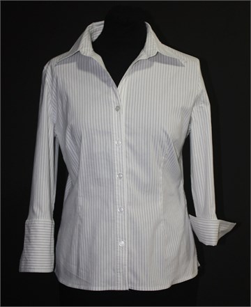 H&M košulja sa poludugim rukavima, bijele boje sa crnim prugama. Prednje kopčanje, strukirana. Rastezljiva.