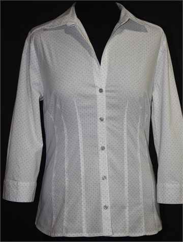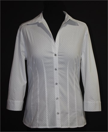 H&M košulja sa poludugim rukavima, bijele boje sa sitnim sivim točkastim printom. Prednje klasično kopčanje, prednji i stražnji ušitci (strukirana). Na krajevima rukava po dva gumbića. Blago rastezljiva i lijepo se formira po tijelu :)