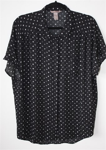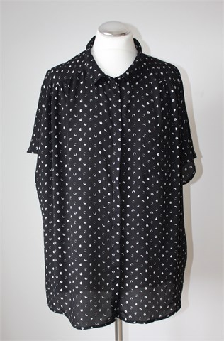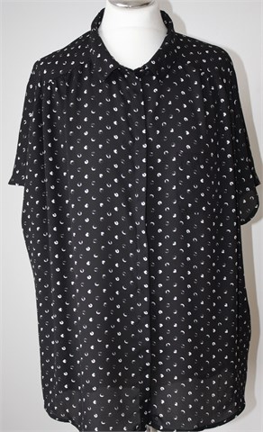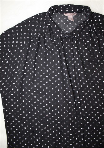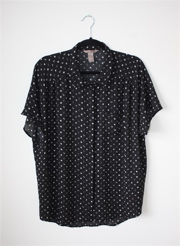H&M košulja sa kratkim rukavima, crne boje sa bijelim printom (uzorak printa vidljiv na slikama). Prednje skriveno kopčanje, mali džepić na prsima. Nije rastezljiva.