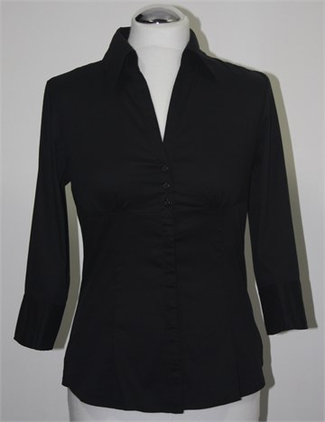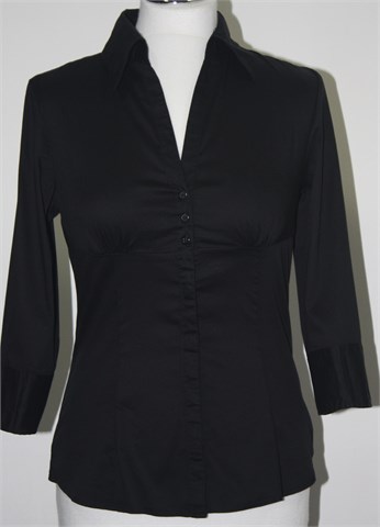 H&M košulja crne boje sa poludugim rukavima. Prednje klasično kopčanje (donji dio gumbi je skriven), prednji i stražnji ušitci (strukirana). Rezana ispod grudi, ušitci na prsima. Mekan, gladak i rastezljiv materijal, vrlo lagan.