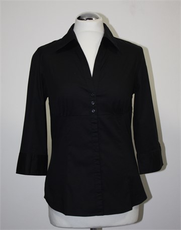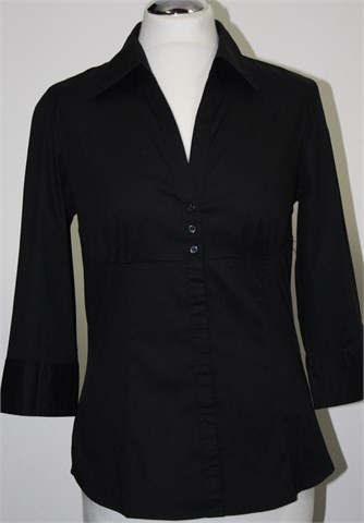 H&M košulja sa poludugim rukavima, crne boje. Prednje kopčanje sa gumbima (donji dio gumbića je skriven). Tanji, mekan i rastezljiv materijal.