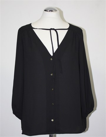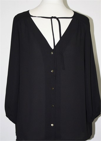 H&M košulja sa poludugim rukavima, crne boje. Prednje kopčanje sa zlatnim gumbima (blago oguljena boja), vezice u gornjem dijelu (vidljivo na slikama). Tanja, lagana i blago providna.