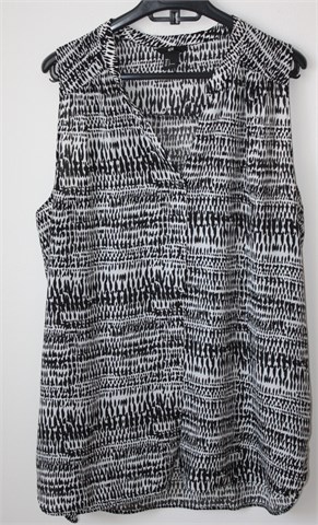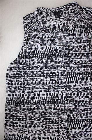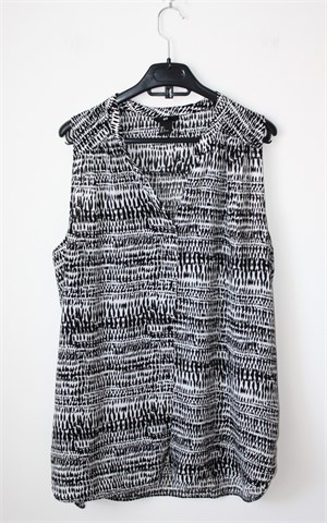 H&M košulja/tunika bez rukava crno-bijele boje sa uzorkom (vidljivo na slikama). Prednje kopčenje, bočni prorezi. Različiti materijali sa prednje i stražnje strane (uzorak je jednak, sastav materijala je isti). Materijal sa stražnje strane je rastezljiv.
