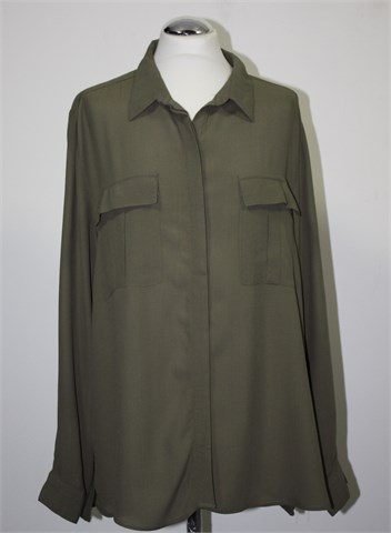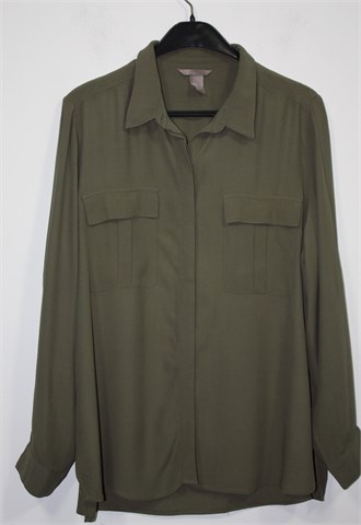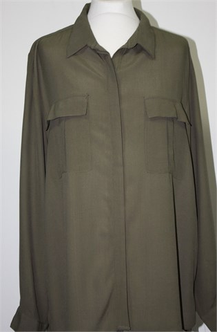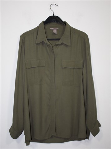 H&M košulja sa dugim rukavima (mogu se nositi i kao kraći - vezica unutar rukava i vanjski gumbić na rukavu) maslinasto zelene boje. Prednje skriveno kopčanje, džepići sa preklopom na prsima, mali bočni prorezi. Lagan i nerastezljiv materijal.