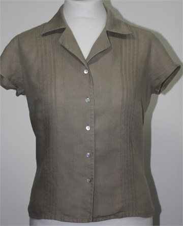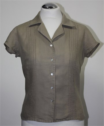 H&M košulja od lana khaki boje (nešto između svijetlo maslinaste i bež boje). Kratki rukavi, prednje klasično kopčanje sa sedefastim gumbićima. Ukrasni prošivi sa prednje i stražnje strane. Prednji i stražnji ušitci, strukirana.