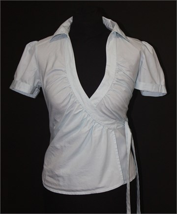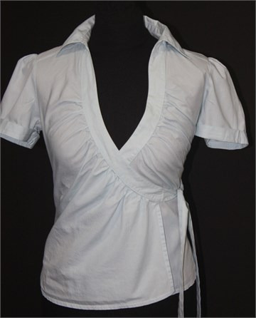 H&M košulja sa kratkim rukavima, prugasta kombinacija plave i bijele boje (ne vidi se baš na slici, pruge su tanke). Sa prednje strane preklop i vezanje. Blagi puf rukavi.