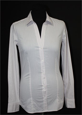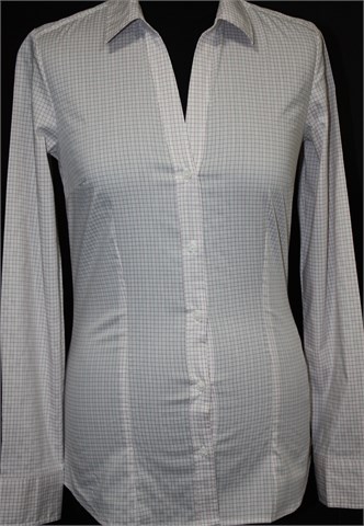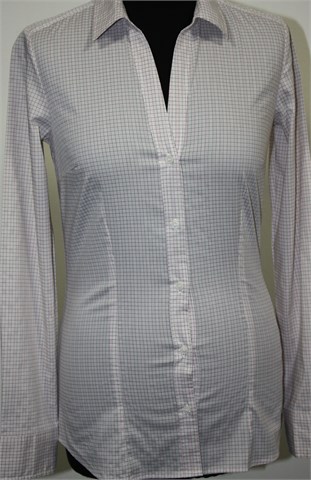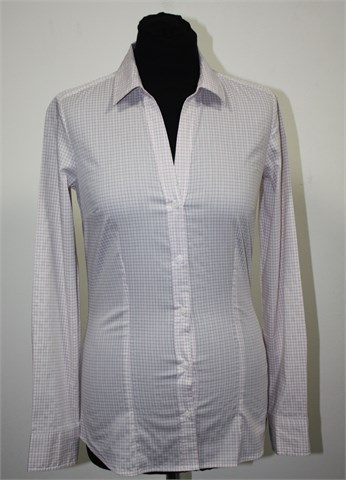 H&M košulja sa dugim rukavima, kockasti uzorak u bijelo-rozoj kombinaciji (rubovi kockica su crne boje). Prednje kopčanje, strukirana. Blago rastezljiva.