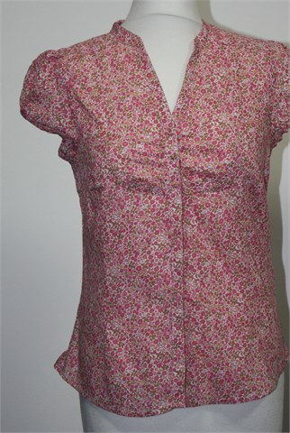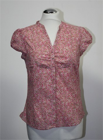 H&M košulja sa kratkim rukavima, podloga je bijele boje sa cvjetnim printom (većinom u rozoj, žutoj i zelenoj boji). Prednje kopčanje (donji dio kopčanja je skriven), blago strukirana. Lagan i prozračan pamuk.