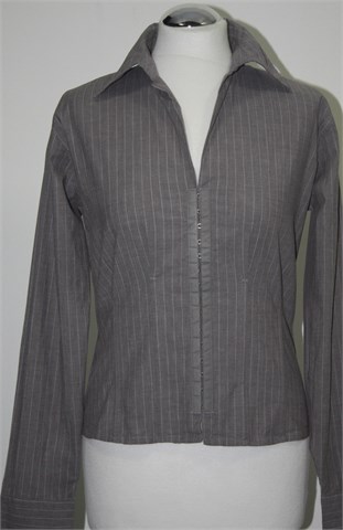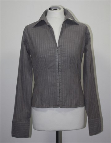 H&M košulja sa dugim rukavima, prošarano sive boje sa bijelim prugicama. Prednje kopčanje sa malim kopčicama (iste kopčice su i na krajevima rukava), ušivene plastične žice (kao na korzetu) sa prednje i stražnje strane (u donjem dijelu) tako da odlično stoji :) Materijal je blago rastezljiv pa se odlično prilagođava tijelu.