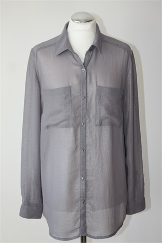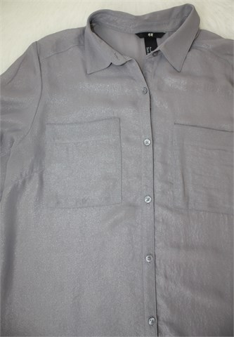 H&M košulja sa dugim rukavima, sive boje sa srebrnim sjajem. Prednje kopčanje, džepići na prsima. Tanja i lagana, providna. Blago rastezljiva.