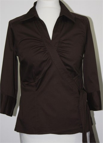 H&M košulja sa poludugim rukavima, tamno smeđe boje. Sa prednje strane preklop (vezanje sa unutrašnjom i vanjskom bočnom vezicom). Mekan i vrlo rastezljiv materijal.