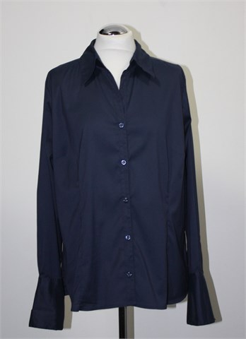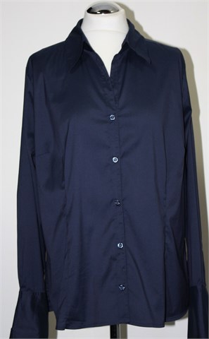 H&M košulja sa dugim rukavima, tamnije plave boje (blago sjajan materijal, nešto tamnija uživo nego na slici). Prednje kopčanje, blago strukirana. Mekan, tanji i rastezljivi materijal.