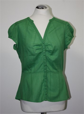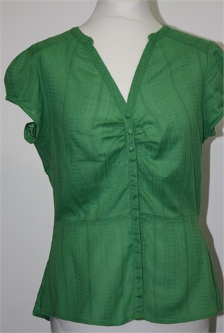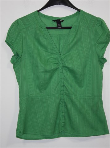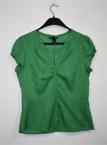 H&M košulja sa kratkim rukavima, zelene boje sa diskretnim uzorkom na materijalu (vidljivo na slikama). Prednje kopčanje (donji dio kopčanja je skriven), blago stegnuta na krajevima rukava. Tanji i lagan pamuk.