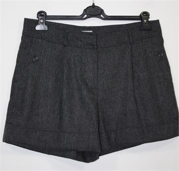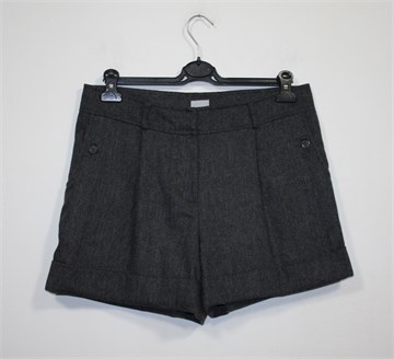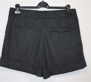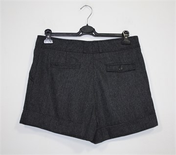 H&M zimsko/jesenske kratke hlače prošarano sive boje sa uzorkom na materijalu (kao sitni uzorak riblje kosti). Prednji cif i kopčanje, pasica za remen. Bočni džepovi sa gumbom, mali stražnji džepovi (jedan sa preklopom i gumbom, drugi skriveni).