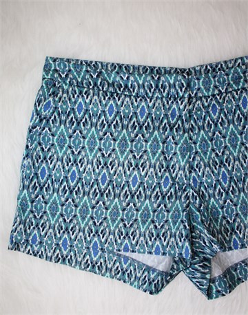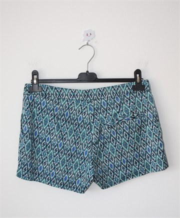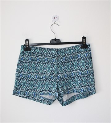 H&M kratke hlače sa šarenim printom (boje i uzorci vidljivi na slikama). Prednji cif i kopčanje, prednji bočni džepovi (jedan stražnji ukrasni/lažni džep). Blago rastezljive.