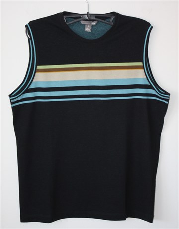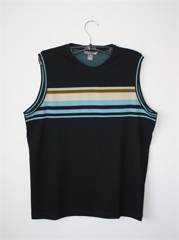 H&M majica bez rukava, crne boje (unutrašnjost majice je plavo-crna). Sa prednje strane pruge (vidljivo na slikama). Tanji, mekan i rastezljiv materijal.