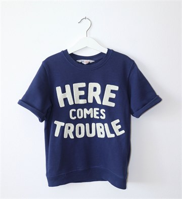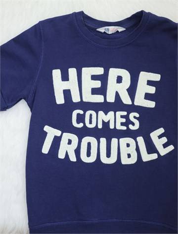 H&M majica sa kratkim rukavima, tamno plave boje sa prednjim ušivenim natpisom (vidljivo na slikama). Deblji i kvalitetan materijal (kao za trenirke), malo rastezljiv. Unisex model.