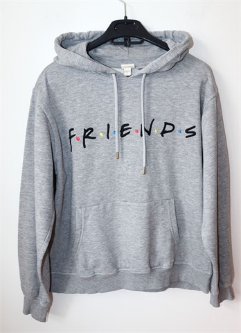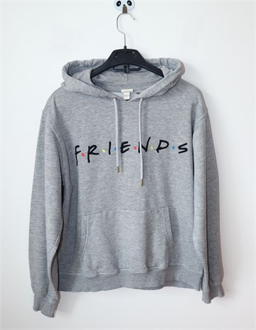 H&M (Warner Bros.) majica sa dugim rukavima prošarano sive boje, sa prednje strane natpis "Friends". Kapuljača, prednji džep. Mucasta iznutra, deblji pamuk. Unisex model.