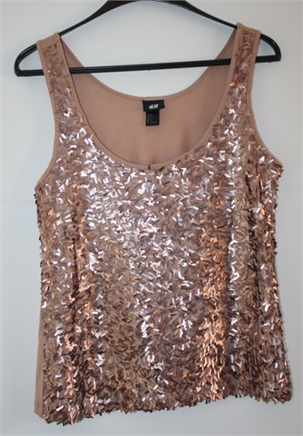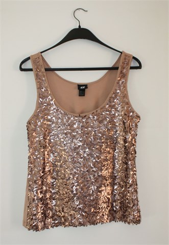 H&M majica bez rukava, tamno bež boje. Sa prednje strane našivene su šljokice, stražnja strana je bez ukrasa. Mekana i rastezljiva.