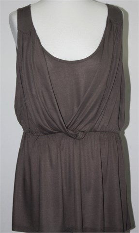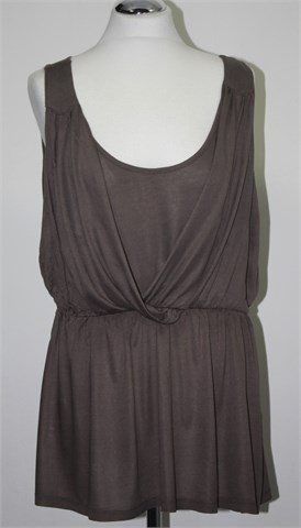 H&M majica bez rukava/topić smeđe boje. Prednji dio sa fiksnim preklopom, ispod prsiju gumica (i sa stražnje strane), prema dolje se blago širi. Mekana i rastezljiva viskoza.