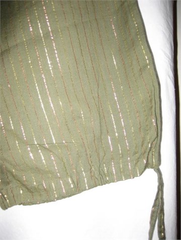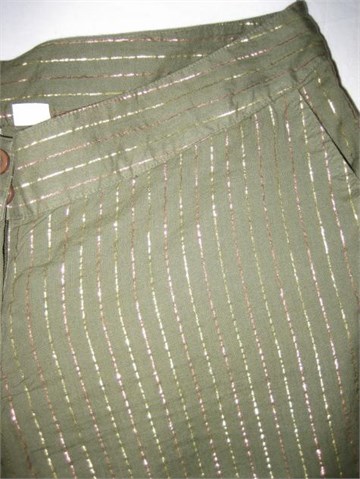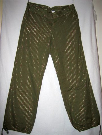 98% pamuk 2% metalik niti, dva džepića na stražnjoj strani, dva prednja, vezice na nogavicama, široke i lagane, sjajne zlatne i brončane prugice