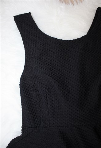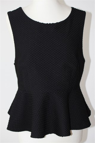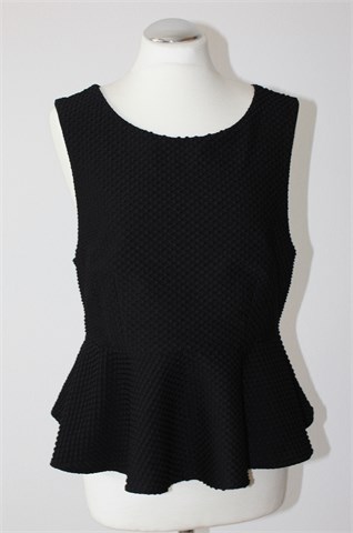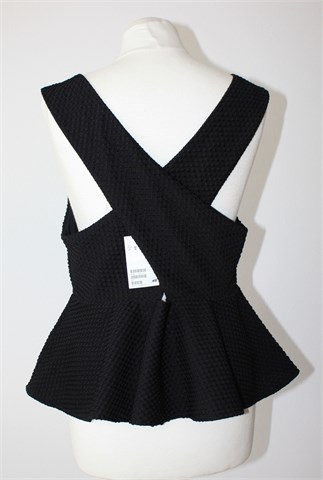 H&M peplum topić crne boje, na materijalu uzorak (vidljiv na slikama). Bez rukava, naramenice se na leđima križaju. Podstavljen (cijeli osim volančića). Rastezljiv.