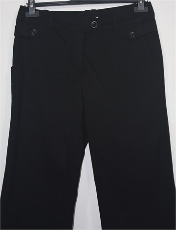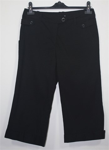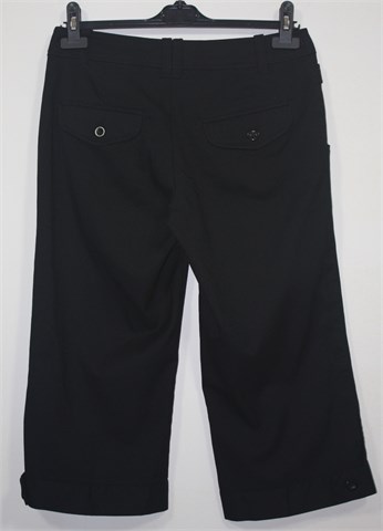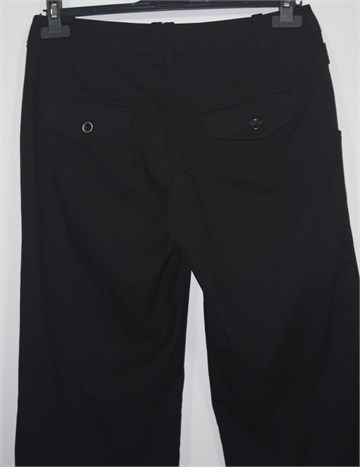 H&M poluduge hlače crne boje, klasičnog kroja. Prednji cif i kopčanje, pasica za remen. Prednji bočni, stražnji džepovi na preklop sa gumbom. Vrlo blago rastezljive.