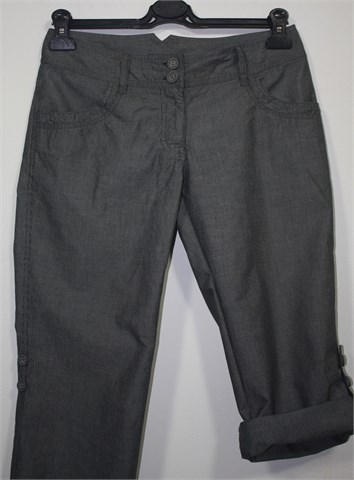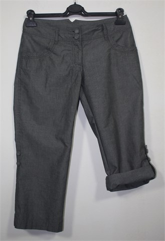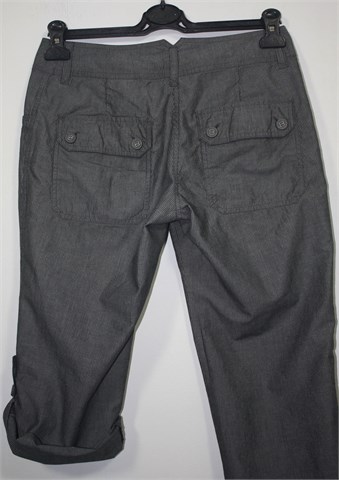 H&M poluduge hlače sive boje sa bijelim prugama. Prednji cif i kopčanje, pasica za remen. Prednji i stražnji džepovi, tanji materijal. Nogavice se mogu dodatno skratiti (pomoću unutarnje vezice i vanjskih gumbića na nogavici - kao jedna nogavica na slici).