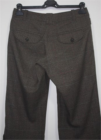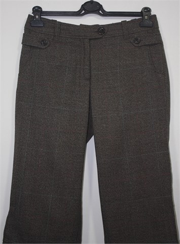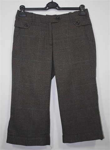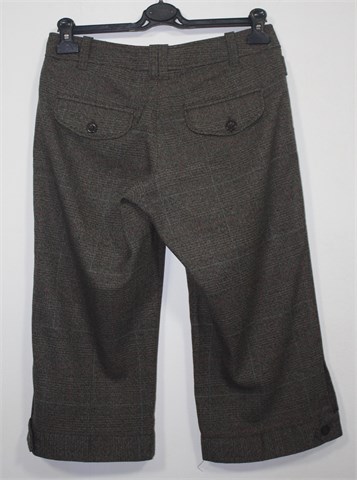 H&M poluduge hlače od štofastog materijala. Boja je pretežno smeđa sa diskretnim prugicama u crvenoj i plavoj boji. Prednji bočni džepovi i stražnji na preklop sa gumbićem. Prednji cif i kopčanje, pasica za remen. Na dnu nogavica mandžete sa gumbom i malim prorezom.
