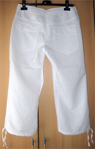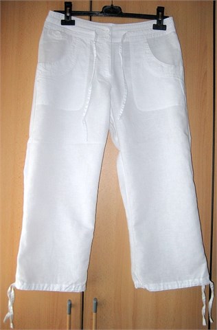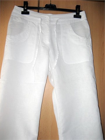 Prekrasne poluduge ljetne hlače od mješavine lana i pamuka. Prednji cif i kopčanje, pasica sa trakicom za zatezanje. Dva prednja velika džepa, dva stražnja džepa na preklop. Na dnu nogavica špagice za zatezanje.