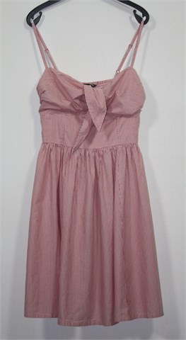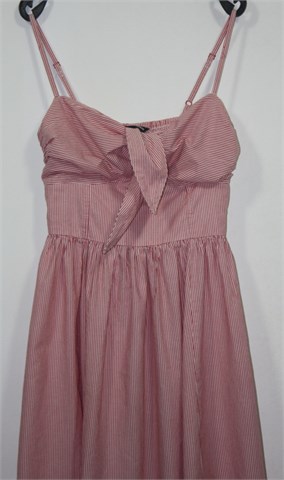 H&M ljetna pamučna haljina, prugasta kombinacija crvene i bijele boje. Tanke, prilagodljive naramenice (kao na grudnjaku), vezanje sa prednje strane. Sa stražnje strane (na leđima) rastezljive gumice pa je širina prilagodljiva.