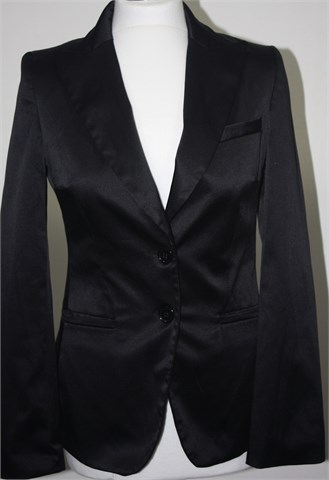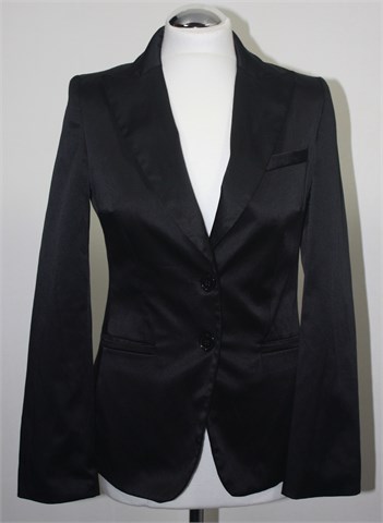 H&M prekrasan sako od satena, crne boje. Prednje kopčanje, bočni džepovi i džepić na prsima. Blagi jastučići u ramenima, strukiran. Podstavljen, blago rastezljiv i blago sjajan materijal.