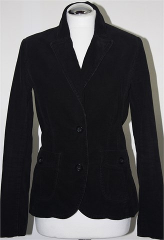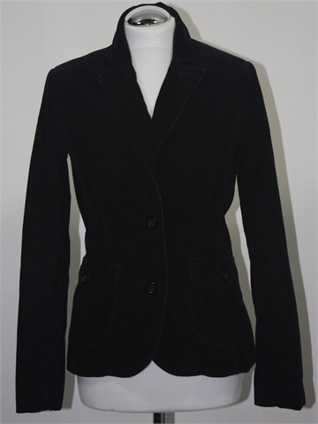 H&M sako/jakna od samta crne boje (mjestimično used look). Prednje kopčanje, dva bočna džepa. Blagi jastučići u ramenima, podstavljen.