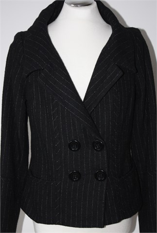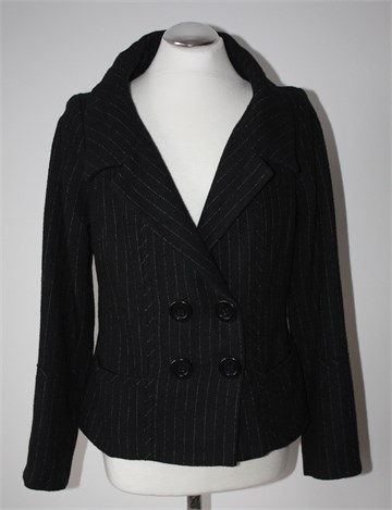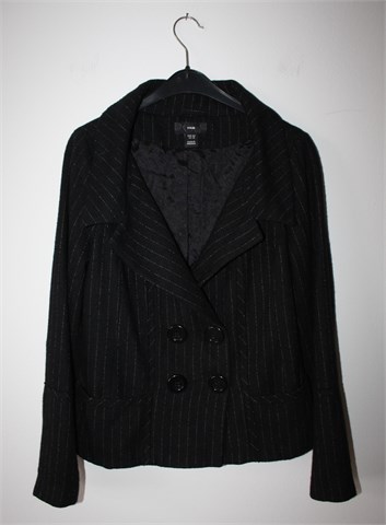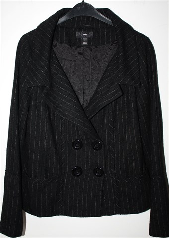 H&M topliji sako/kratki kaputić od tvida, crne boje sa bež isprekidanim prugama. Prednje kopčanje, bočni džepići. Podstavljen.