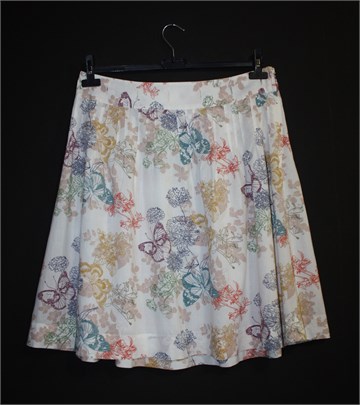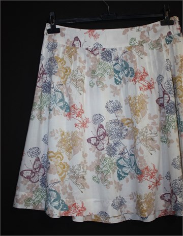 H&M pamučna suknja, bijele boje sa šarenim printom (boje i uzorci kao na slici). Bočni cif i gumbić, u pasici rupice kroz koje se može (i ne mora) provući ukrasna trakica ili remenčić (ne dolazi uz suknju). Ispod pasice ukrasni ušitci. Tanak i lagan pamuk, nema podstavu pa je materijal blago providan.