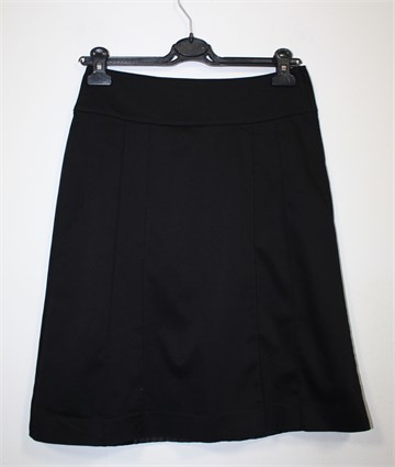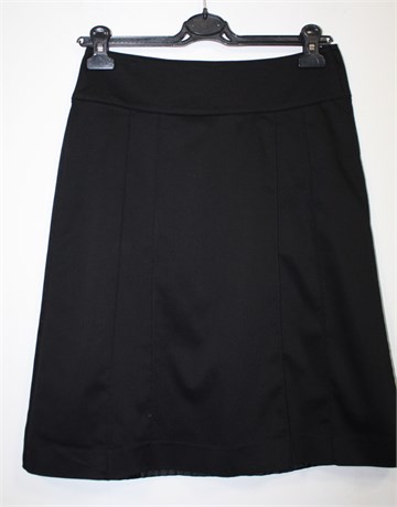 H&M suknja crne boje sa prednjim i stražnjim ukrasnim prošivima. Bočni cif i gumbić, podstavljena. Vrlo blago sjajan materijal.