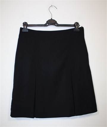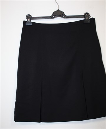 H&M suknja klasičnog kroja, crne boje. Sa prednje strane dvije faldice, bočni cif. Podstavljena, tanji štofasti materijal.