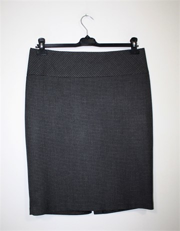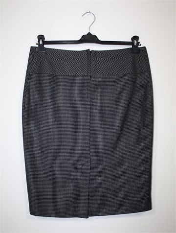 H&M suknja midi dužine, crno-sive boje sa pepita uzorkom (vidljivo na slikama). Stražnji cif i kopčanje, rasporak (po sredini). Podstavljena. Tanji štofasti materijal.