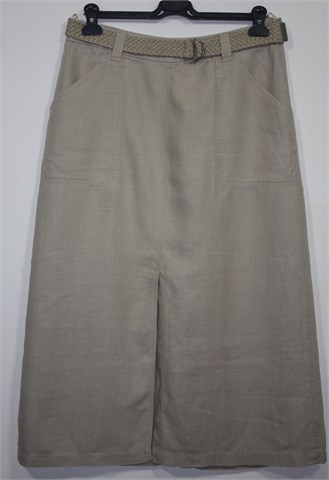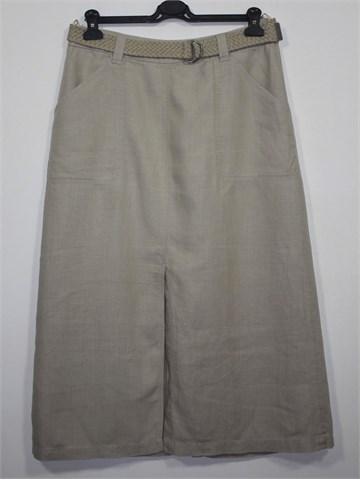 H&M duža suknja od lana, svijetlo bež boje. Bočni cif i kopčanje, pasica za remen i pripadajući pleteni remen. Prednji bočni džepovi. Rasporci sa prednje i stražnje strane (po sredini, na istom mjestu sa obje strane).