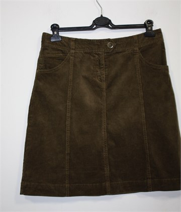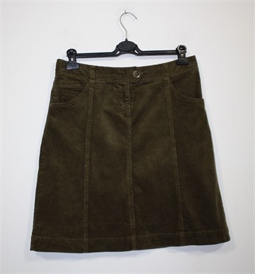 H&M suknja od samta maslinasto-smeđe boje. Prednji cif i kopčanje, pasica za remen. Prednji džepovi. Malo rastezljiva.