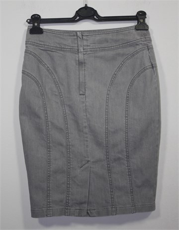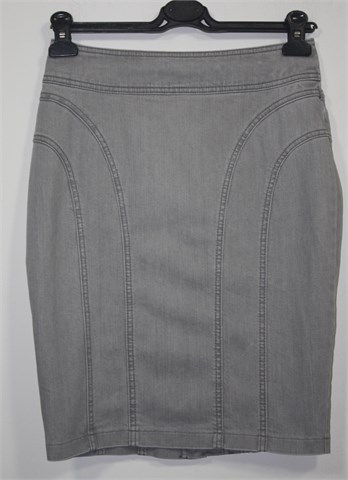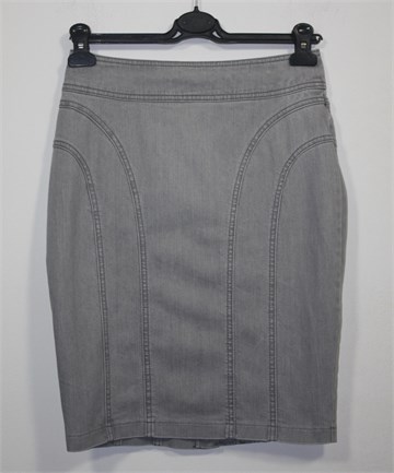 H&M suknja od trapera sive boje. Ukrasni prošivi sa prednje i stražnje strane (pencil kroj). Stražnji cif i gumbić, mali prorez sa stražnje strane. Vrlo blago rastezljiva.