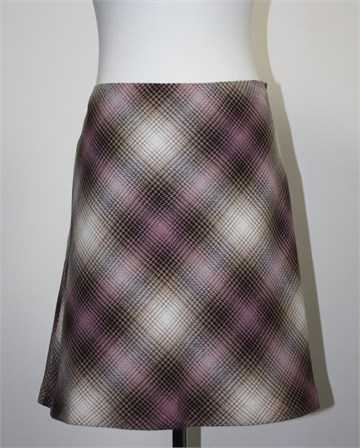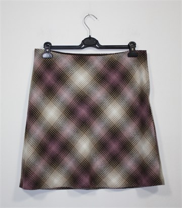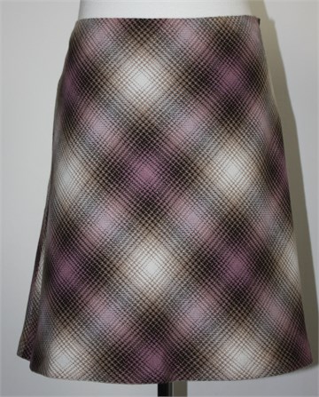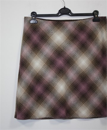 H&M suknja u kombinaciji smeđe, bijele i svijetlo ljubičaste boje (uzorak vidljiv na slikama). Bočni cif, podstavljena. Materijal je kao tanji štof, blago rastezljiv.
