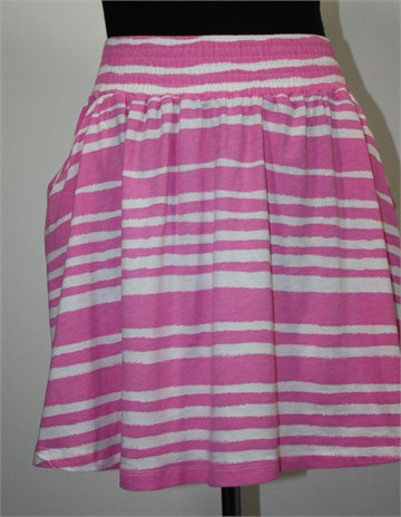 H&M pamučna suknja rozo-bijele boje sa uzorkom. Guma u struku (prilagodljiva širina - vidjeti mjere), bočni džepovi. Tanji i lagan pamuk, rastezljiv.