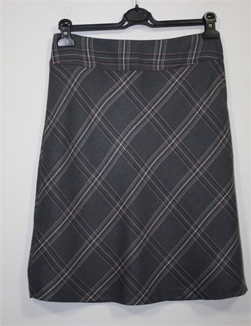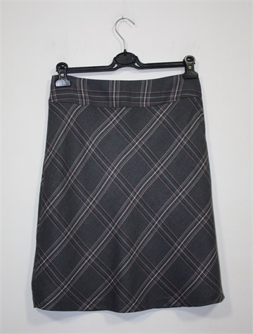 H&M suknja sive boje sa prugastim uzorkom (pruge su u bijeloj, crnoj i rozoj boji). Bočni cif i gumbić, podstavljena. Mekan i tanji štofasti materijal, blago rastezljiv.