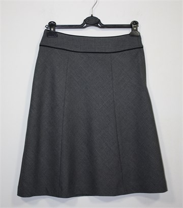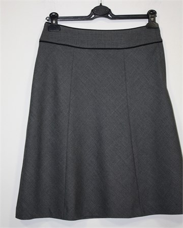 H&M suknja prošarano sive boje, materijal je glatki i tanji štof. Bočni cif i gumbić, crne trakice našivene uz pasicu. Podstavljena, blago rastezljiva.