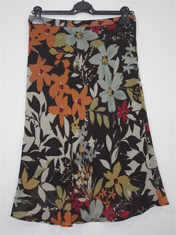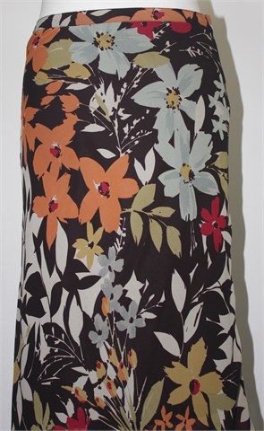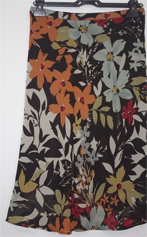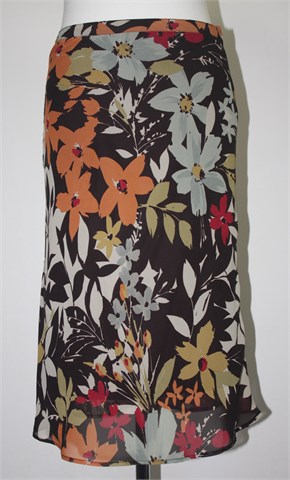 H&M suknja tamno smeđe boje sa cvjetnim printom. Bočni cif i kopčanje (gumbić je otpao), podstavljena (podstava je kod cifa malo oštećena ali ne vidi se kada je suknja obućena). Lagana i lepršava, tanak i prozračan materijal.